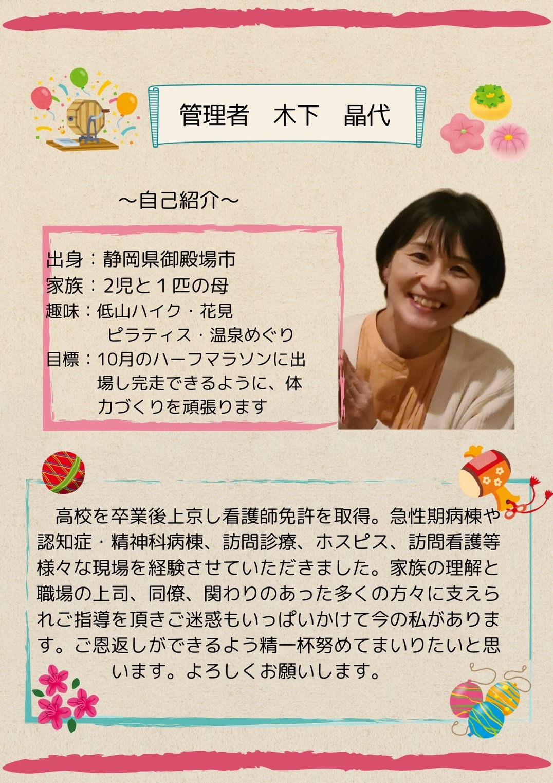 | メッセージ | 母親を自宅で看取った経験から、在宅療養をされるご本人様、ご家族様の力になりたいという思いを強く持つようになりました。 自己満足で終わらず多くの方に笑顔になっていただけるような看護を提供していきたいと思います。 |