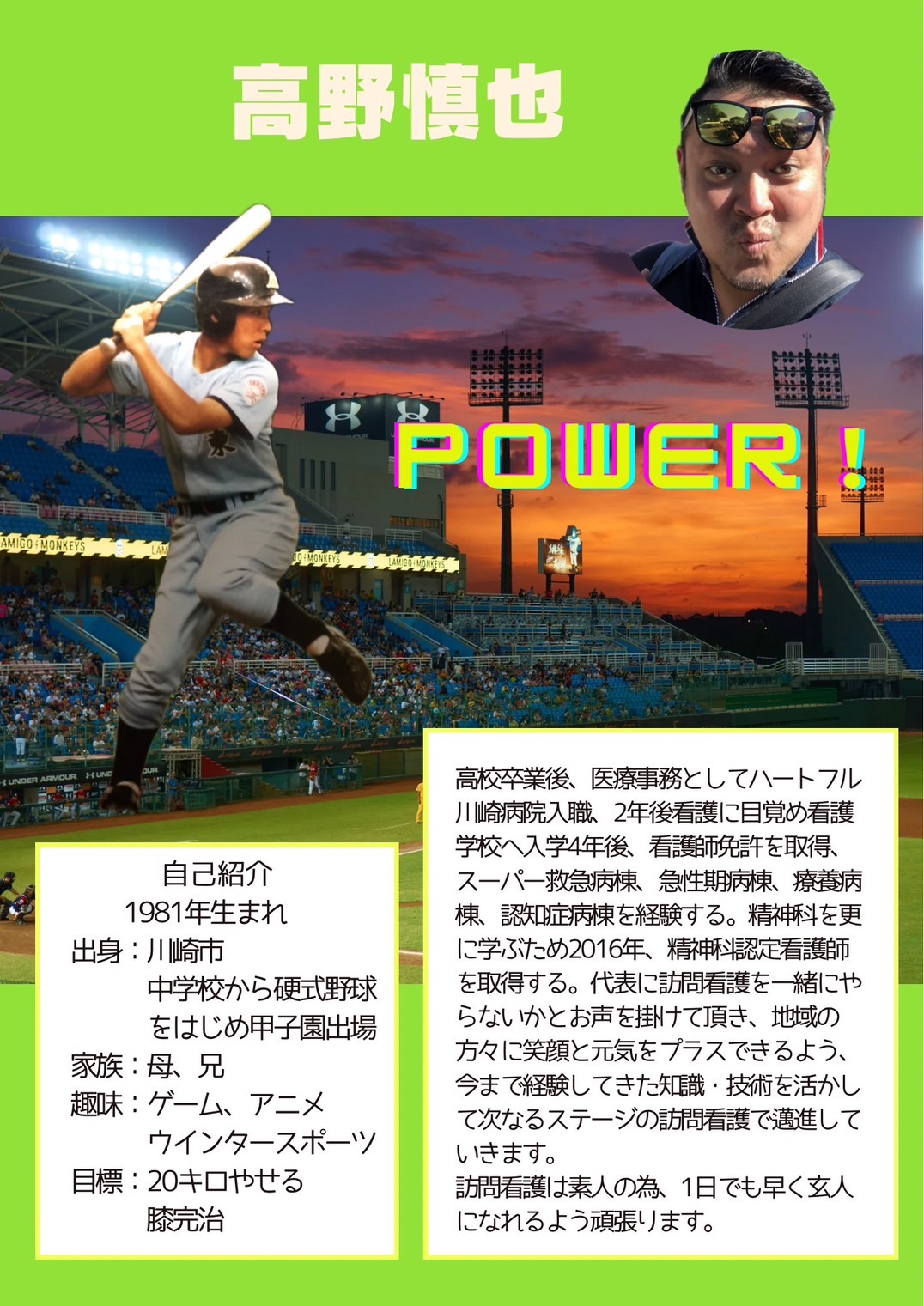 | メッセージ | 体育会系出身で「元気・体力」が取り柄です。 利用者様・ご家族様の意向に沿ったサービスを提供していきます。 身体は大きいですが、怖くはないです。なんでも相談してください。 「その人らしい生活」が維持向上できるよう全力でサポートしていきます。 「できないこと」より「できること」に着目、「強み」を大切にします。 |